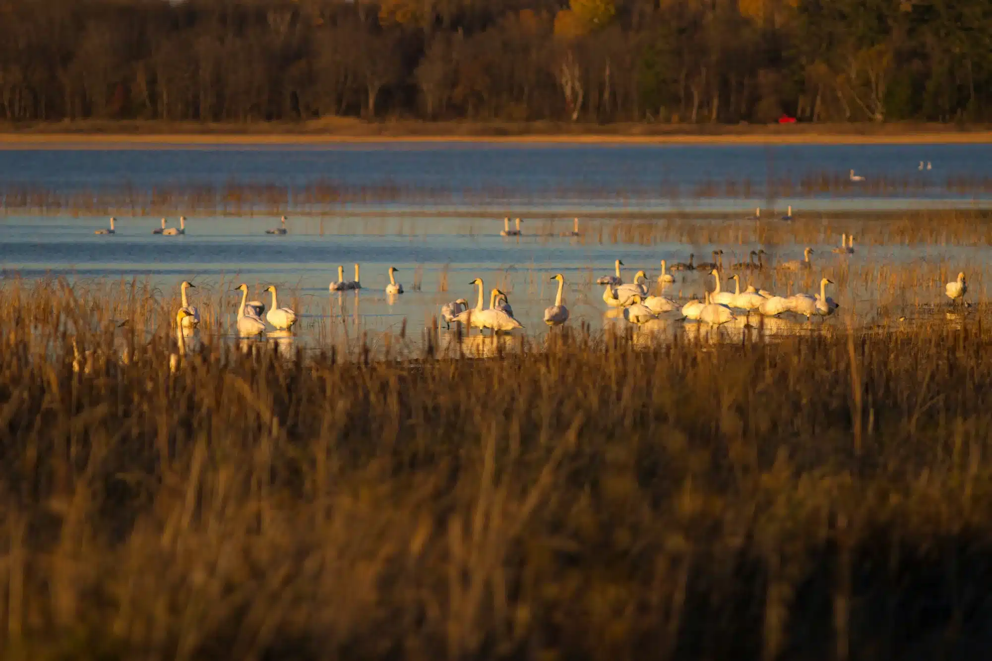 A flock of swans gathered in a lake surrounded by tall brown grass and distant trees, under warm, golden lighting.