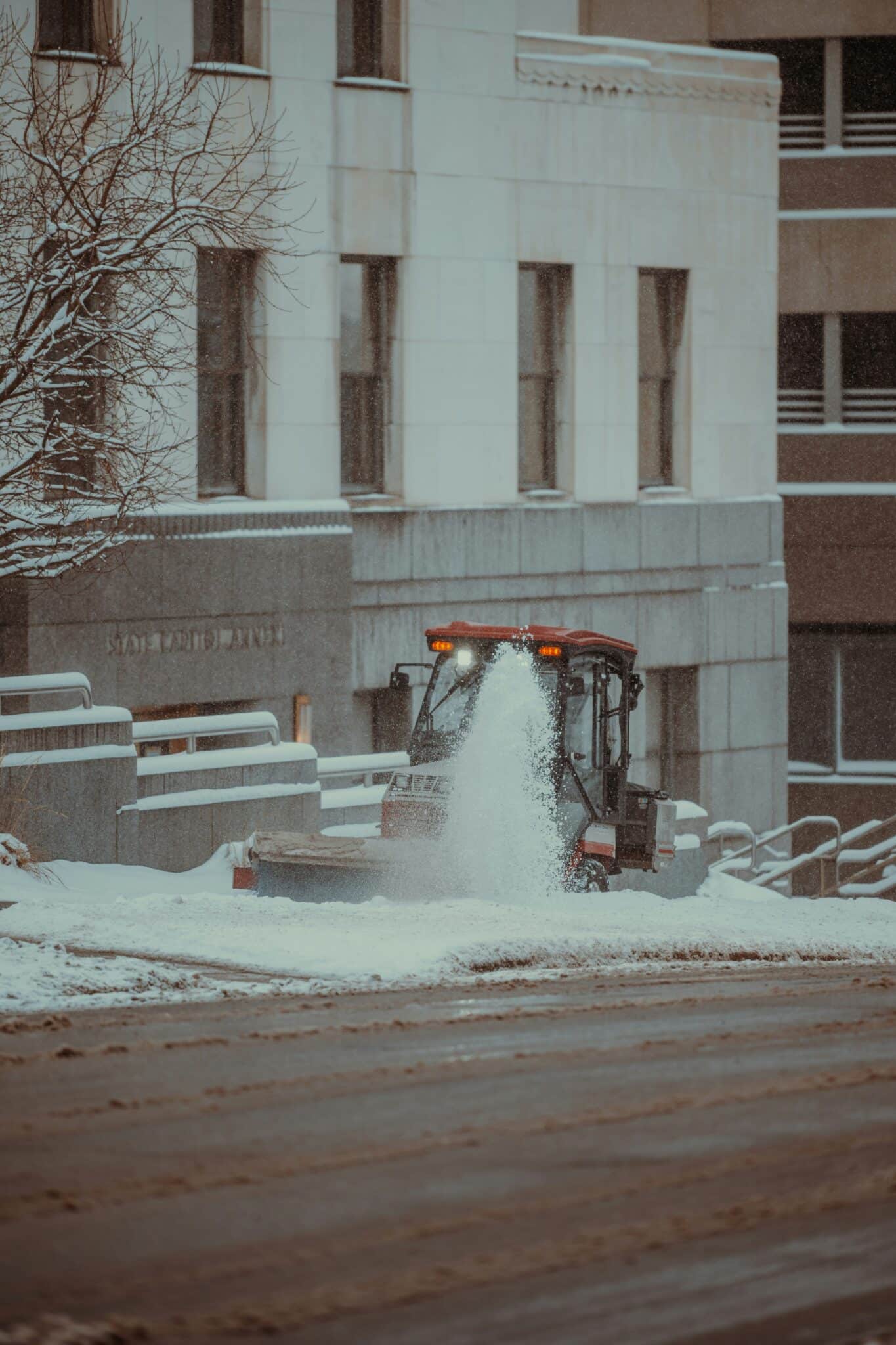 A snow plow clearing snow from a street in an urban area next to a large building, with snow lightly falling and covering the ground.